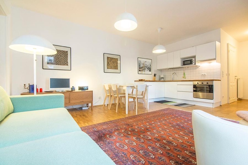 The apartment (ca. 62 sqm) is located in the quiet rear building of a beautiful old building – Wilhelminian style. The spacious living area offers an open kitchen (fully equipped), a dining area and a sofabed. It opens directly onto a balcony facing the pretty courtyard.