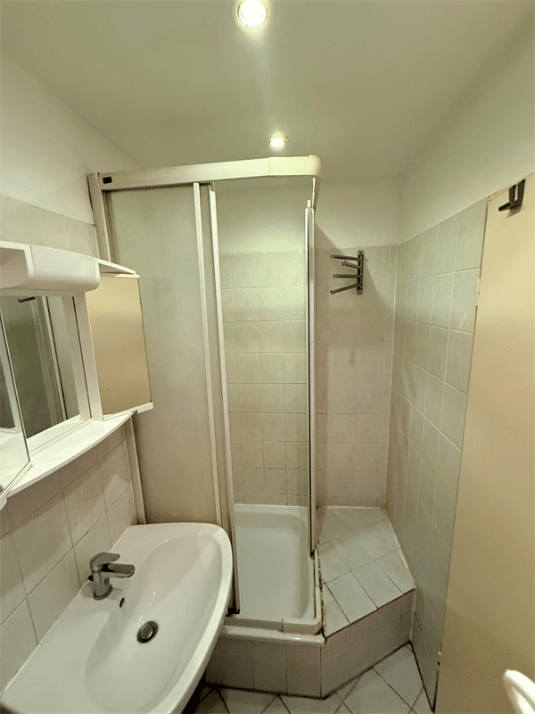 The kitchen is separate and fully equipped, designed for practical everyday use. The bathroom is fitted with a shower and is efficiently arranged. A cellar compartment completes the property, providing valuable additional storage space.