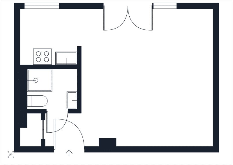 The living and sleeping area forms the heart of the apartment and offers a spacious and versatile space that can easily accommodate a living, sleeping, and dining area. The large windows allow plenty of natural light to enter throughout the day, creating a bright and welcoming atmosphere. A floor-to-ceiling window with a French balcony further enhances the brightness of the room and provides an attractive connection to the outside.