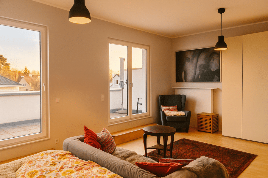 Ceiling heights are generous throughout: 2.55 m in the main living areas and up to 2.80 m on the top floor. Floor-to-ceiling windows enhance the sense of space and bring natural light into every room – including the stairwell and bathrooms.