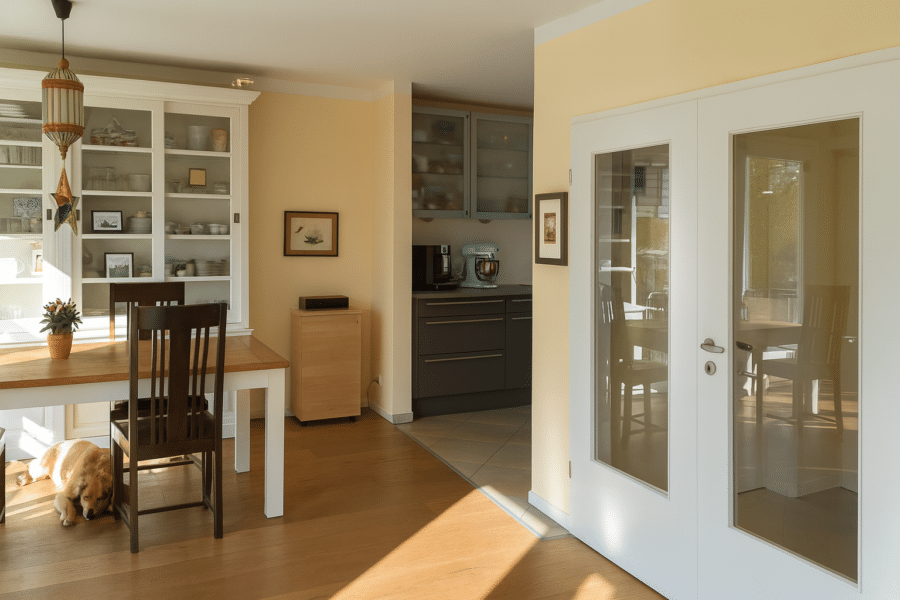 The bright living and dining area on the ground floor opens to the south-facing terrace through two large sliding glass doors. The open-plan kitchen also has direct access to the garden, making it ideal for seamless indoor-outdoor living all year round.
