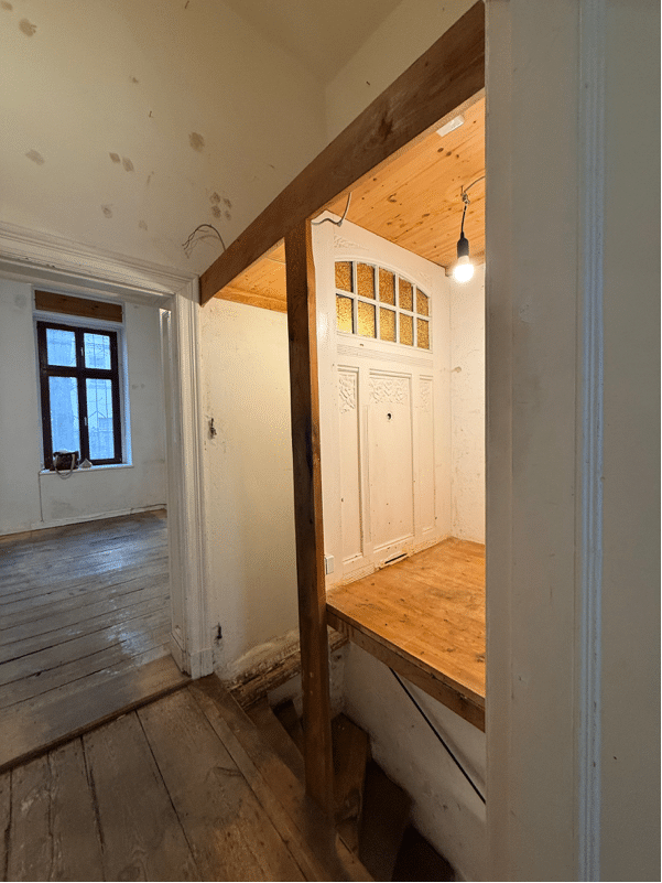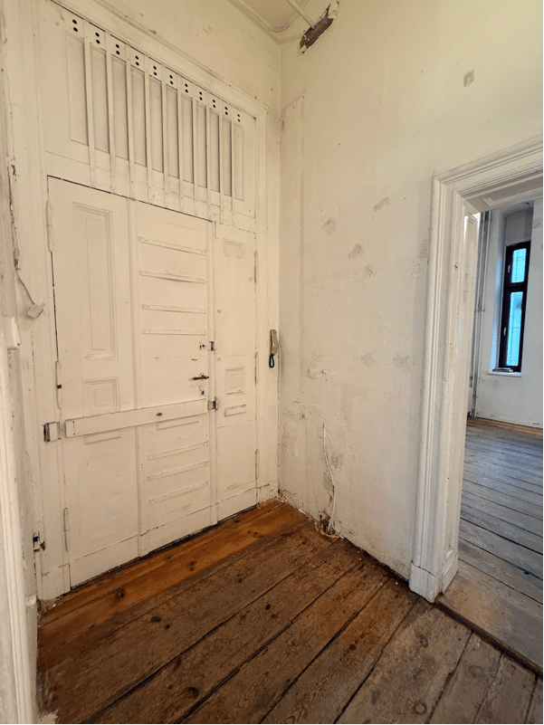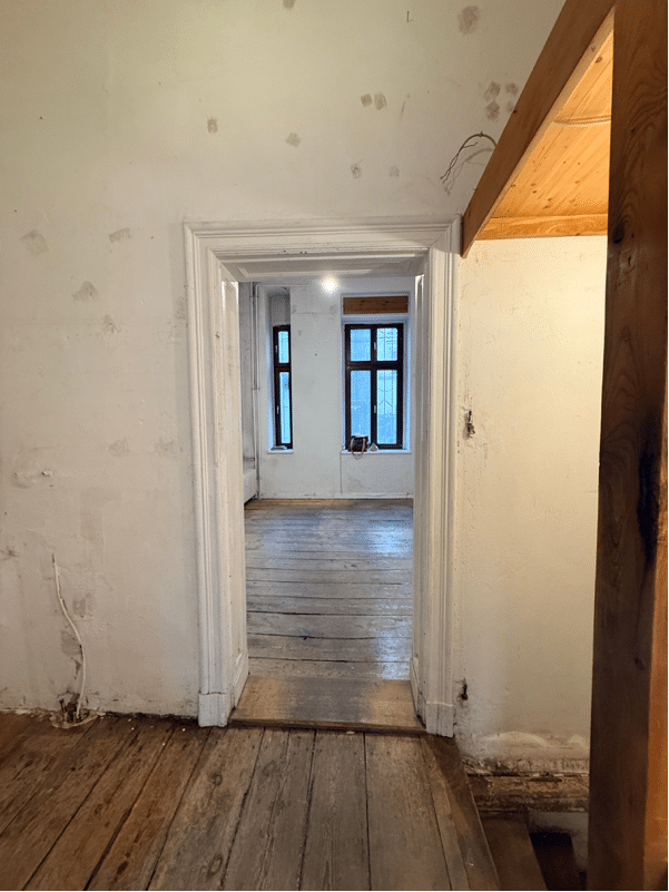 A further room with a window facing the courtyard provides a separate workspace or meeting area. A centrally positioned hallway connects the spaces and leads to the basement. Historic door frames and original wooden elements continue the period charm throughout.