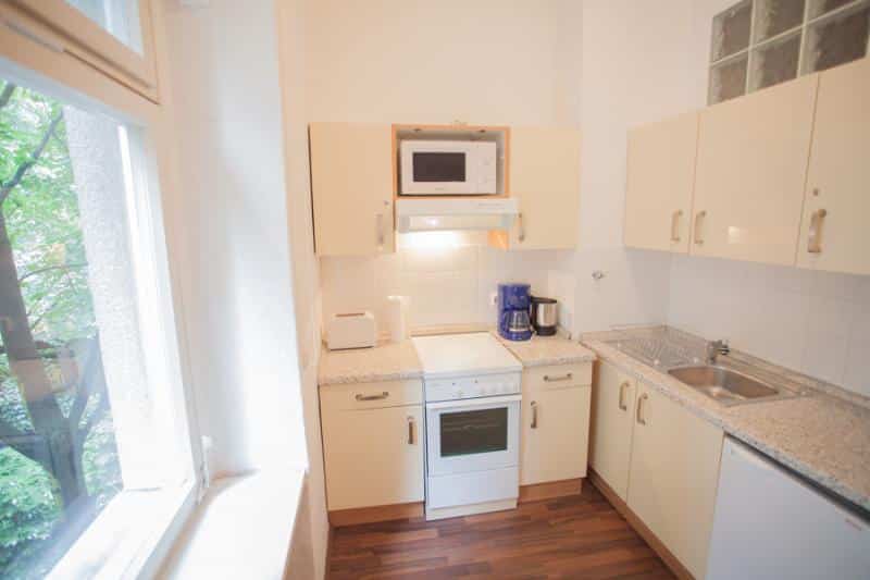 Sie finden die ca. 40 Quadratmeter große Wohnung im 2. Stock, im ruhigen Hinterhaus eines Altbaus. Das geräumige kombinierte Wohn- und Schlafzimmer verfügt über ein bequemes Doppelbett, ein Schlafsofa, zwei Sessel, eine kleine Essecke sowie eine offene, komplett ausgestattete Küche. Das moderne Badezimmer hat eine Badewanne.