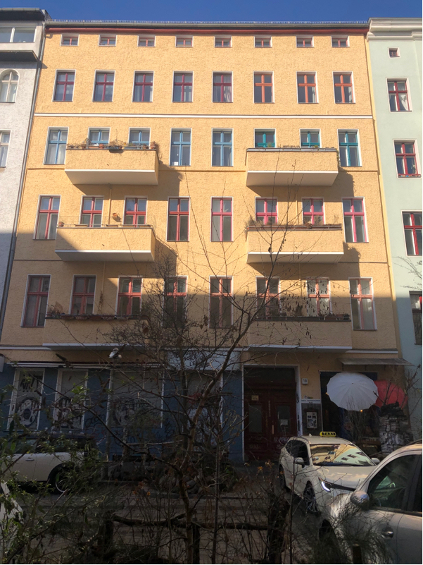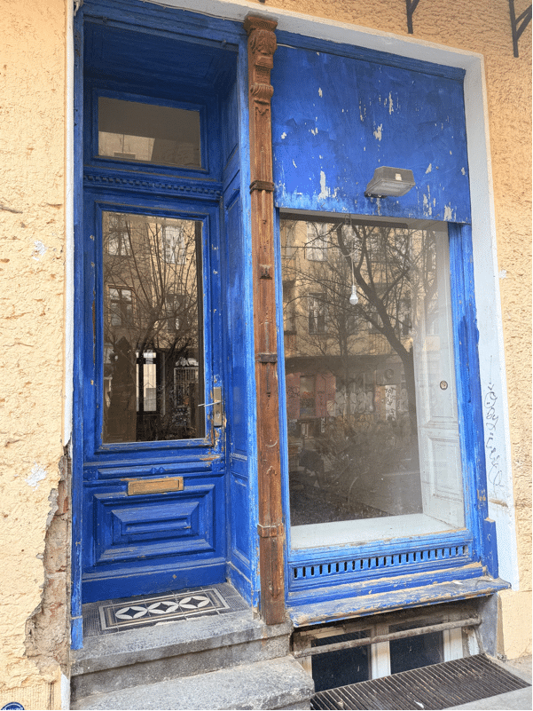Der straßenseitige Bereich besticht durch ein markantes, historisches Eingangsportal in kräftigem Blau sowie eine großzügige Schaufensterfläche. Der direkte Zugang von der Straße gewährleistet gute Sichtbarkeit und eine präsente Lage im Kiez.