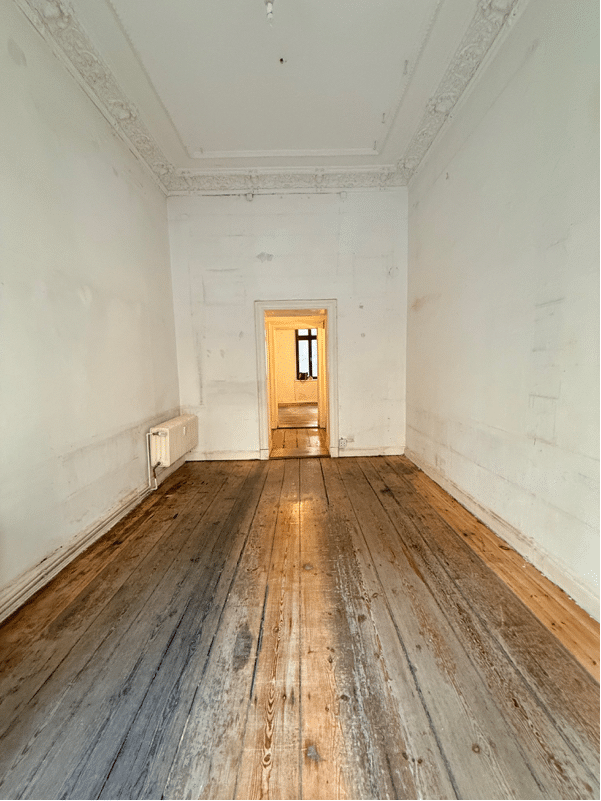 Im Inneren eröffnet sich ein langgezogener Raum mit hohen Decken, Stuckelementen und originalem Dielenboden. Die Holzdielen verleihen der Einheit eine warme, authentische Altbauatmosphäre. Der geradlinige Grundriss ermöglicht eine flexible Nutzung – ideal für Atelier, Büro, Studio, Showroom oder ruhiges Gewerbe.
