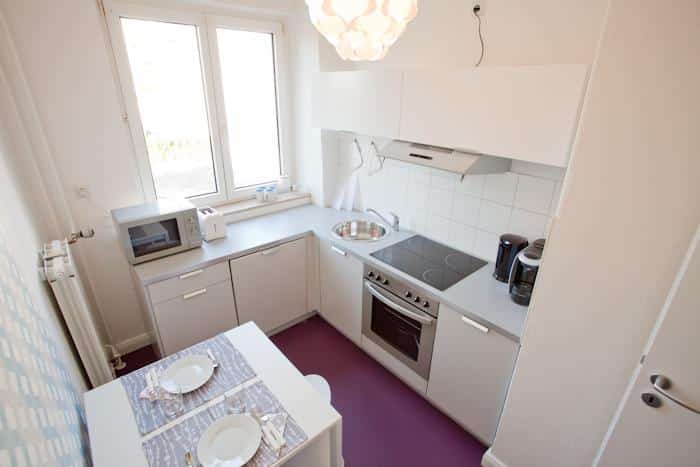 Das Appartement Sonnenallee (ca. 52 m²) liegt im 2. Stock eines Neubaus. Es umfasst zwei Zimmer: ein Wohnzimmer mit Schlafsofa und Schreibtisch und großem Balkon, ein Schlafzimmer mit Doppelbett, eine komplett ausgestattete Wohnküche mit Esstisch und ein Badezimmer mit Badewanne.