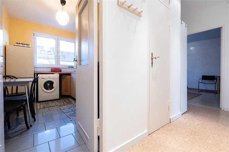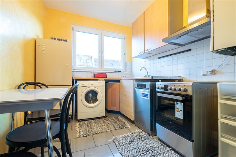 Die großzügig geschnittene 2-Zimmer Wohnung (ca. 56 m²) liegt im 4. Stock eines Neubaus (ohne Fahrstuhl). Vom Wohnzimmer – ausgestattet mit einer Couch, einem Esstisch und einem Schreibtisch – haben Sie Zugang zum Balkon. Das Schlafzimmer verfügt über ein Doppelbett und einen großen Kleiderschrank. Die Küche ist komplett ausgestattet. Das Badezimmer – mit Fenster – hat eine Badewanne. Besonders praktisch: die Kammer für extra Stauraum.