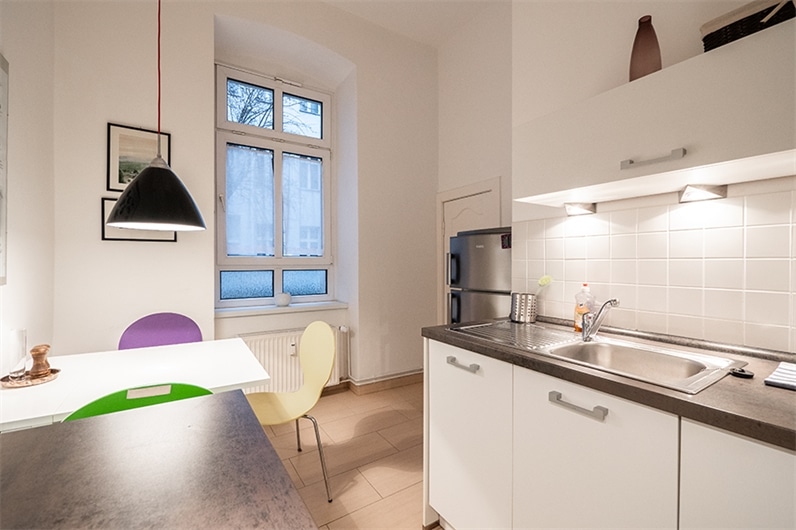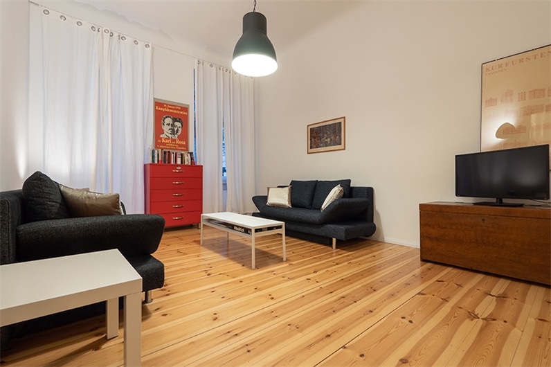 Die geräumige 2-Zimmerwohnung (ca. 60 m²) liegt im Erdgeschoss des ruhigen Hinterhauses eines schönen Altbaus. Im Wohnzimmer finden Sie zwei elegante Sofas. Das Schlafzimmer verfügt über ein bequemes Doppelbett, einen Kleiderschrank, zwei Sessel und eine Kommode. Die Küche ist komplett ausgestattet und hat einen Esstisch. Das Badezimmer hat eine Badewanne. Besonders praktisch: die Wohnung verfügt über eine kleine Kammer für extra Stauraum.