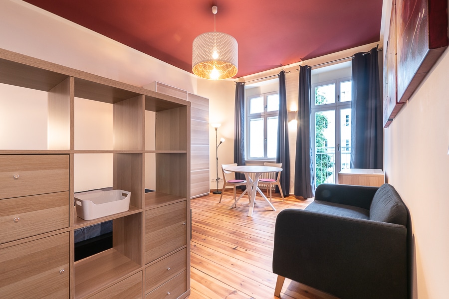 Die ca. 40 Quadratmeter große Wohnung liegt im ersten Stock des ruhigen Seitenflügels eines Altbaus (ohne Fahrstuhl). Das geräumige Wohn- und Schlafzimmer hat ein bequemes Doppelbett, ein gemütliches Sofa, einen Schreibtisch, eine schöne Essecke sowie einen kleinen französischen Balkon. Die separate Küche ist hervorragend ausgestattet. Das moderne Badezimmer hat eine Badewanne.