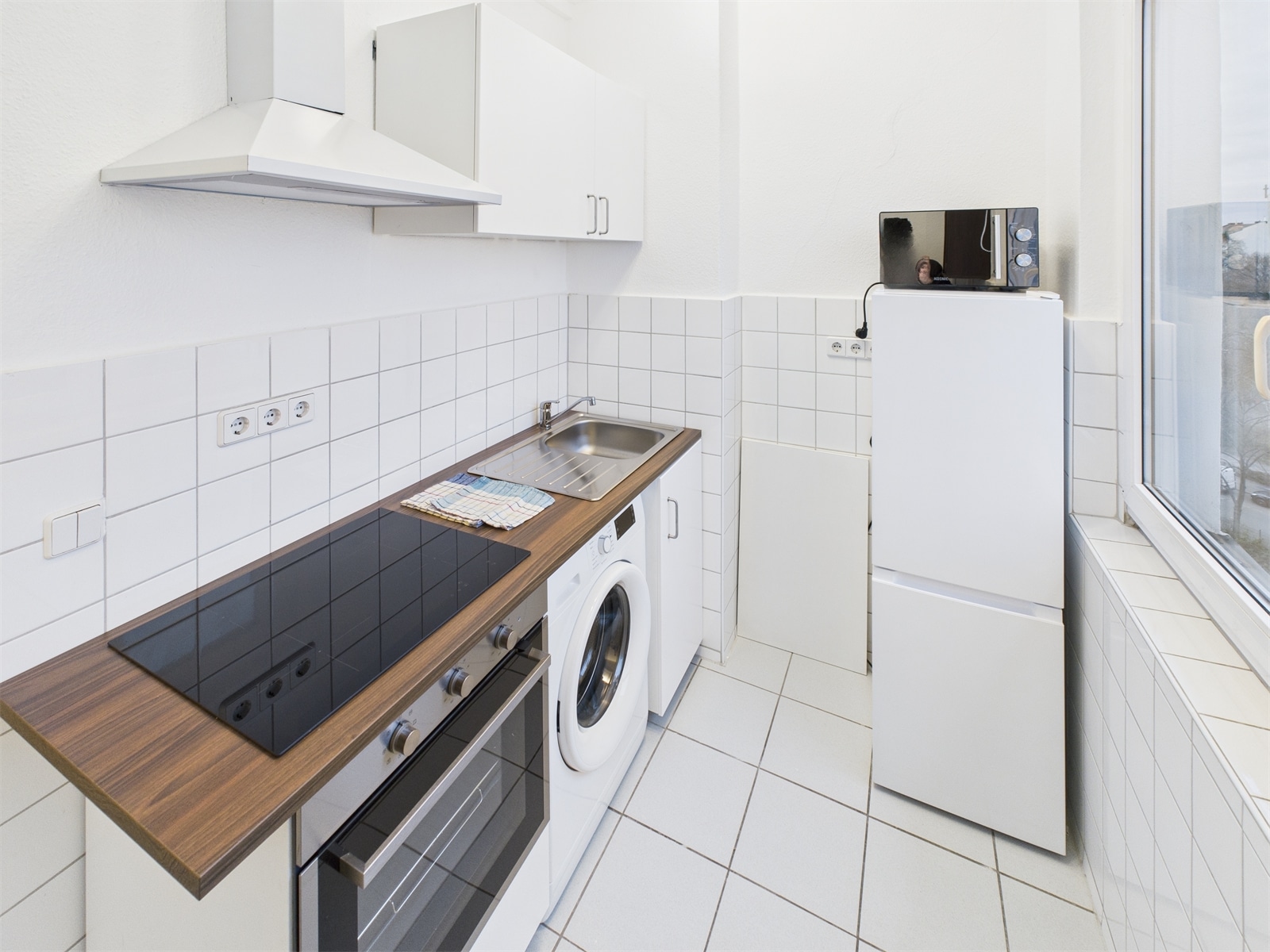 Il monolocale (ca. 40 mq) si trova al 6. piano (con ascensore!) di un condominio moderno. Dispone di una cucina completamente arredata e una lavatrice, un salottino molto stylish e luminoso, fornito di un comodo divano letto. L’appartamento dispone anche di un grande balcone con una bella vista sulla skyline di Berlino. Il bagno è dotato di una vasca.