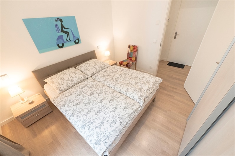 La camera da letto è dotata di letto matrimoniale e di un ampio armadio ad ante scorrevoli. Un ulteriore armadio, sempre scorrevole, è presente nell’’ingresso.