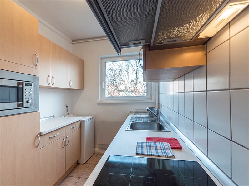 Il bagno è piastrellato di bianco e ha una finestra. La cucina è completamente attrezzata. La camera da letto è luminosa e offre molto spazio con cassettiere e armadi; ha due letti singoli che possono essere trasformati in un letto matrimoniale.