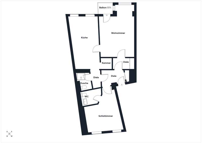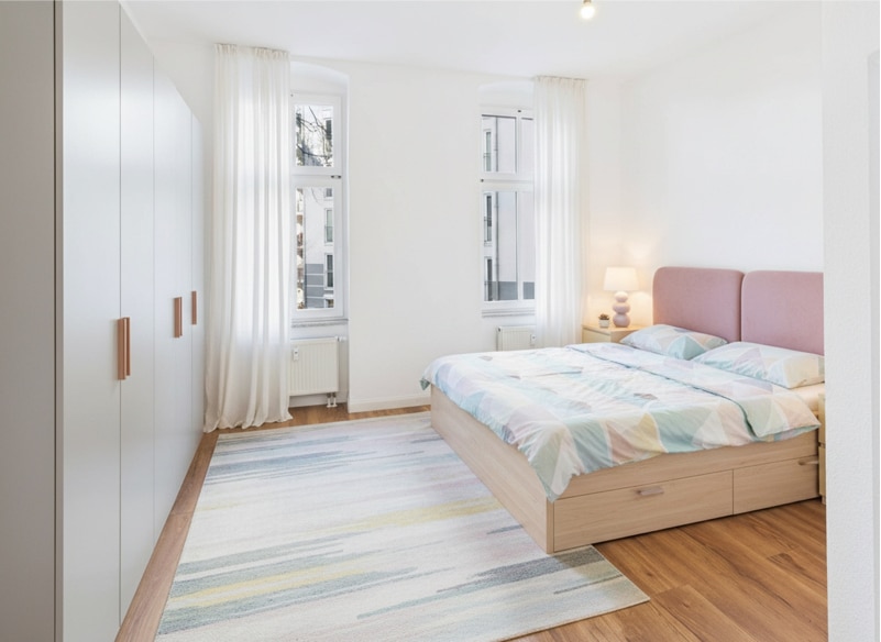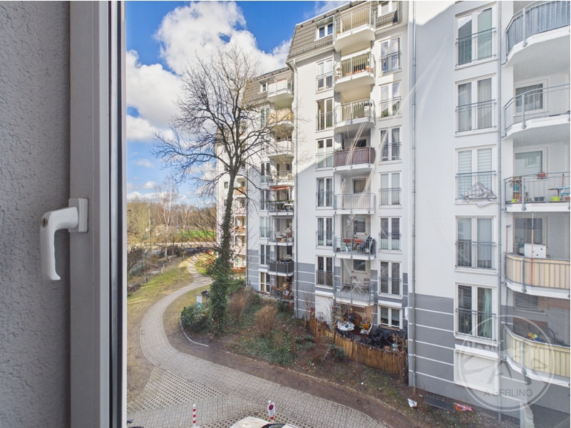 Dal soggiorno si accede al balcone affacciato sulla strada, che amplia lo spazio abitativo verso l’esterno e offre una vista aperta lungo il viale. La camera da letto si trova sul lato più tranquillo dell’edificio, con affaccio verso il Volkspark Friedrichshain.